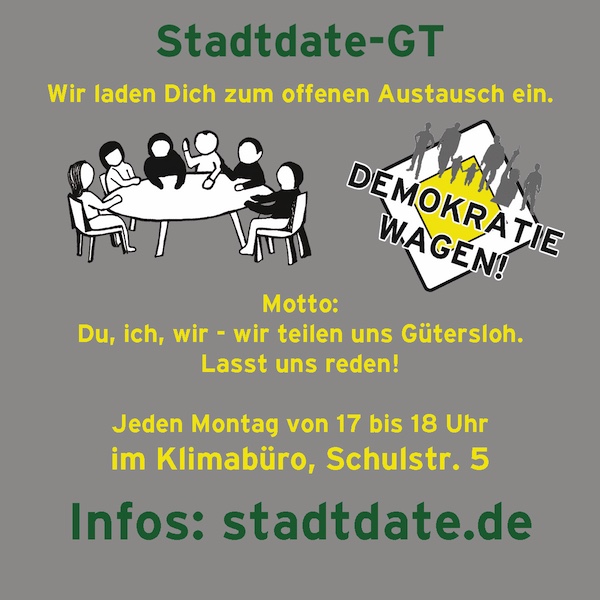Wir laden Dich und Sie zum offenen Austausch für Alle ein. Motto: Du, ich, wir - wir teilen uns Gütersloh.Wir treffen uns wöchentlich jeden Montag